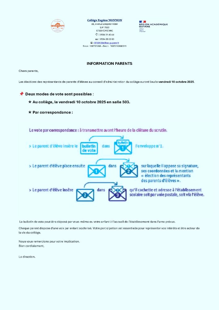 Election des représentants des parents d’élèves au conseil d’administration du collège.